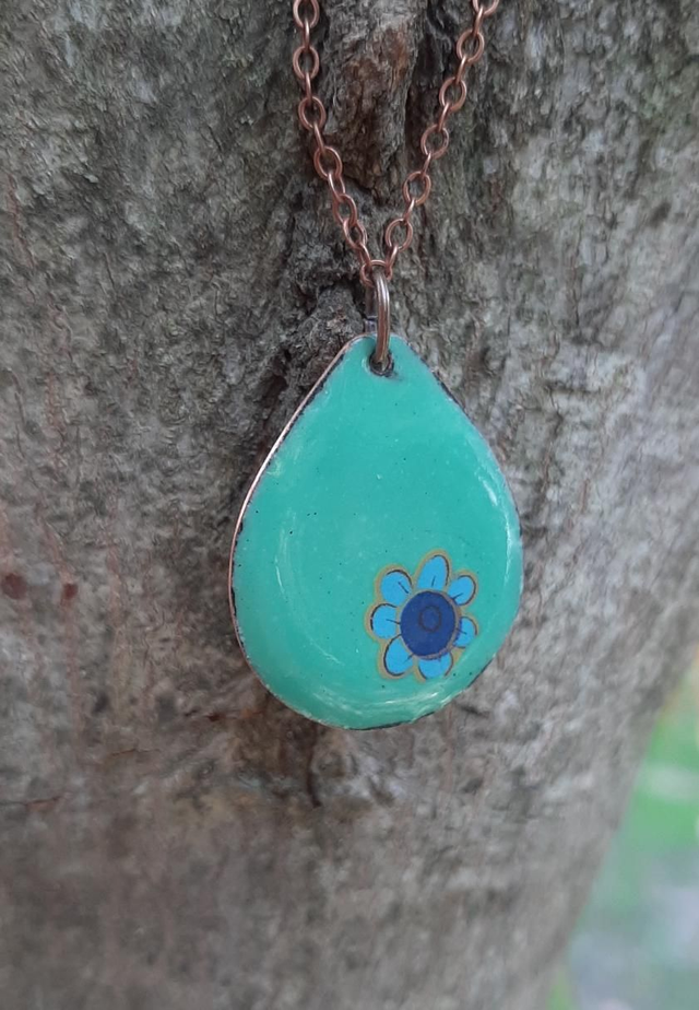 Pendentif vert d'eau fleur bleue