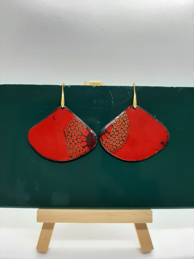 Boucles d'oreilles forme Gingko grandes, rouge motifs impression céramique anemone noire et dorée.